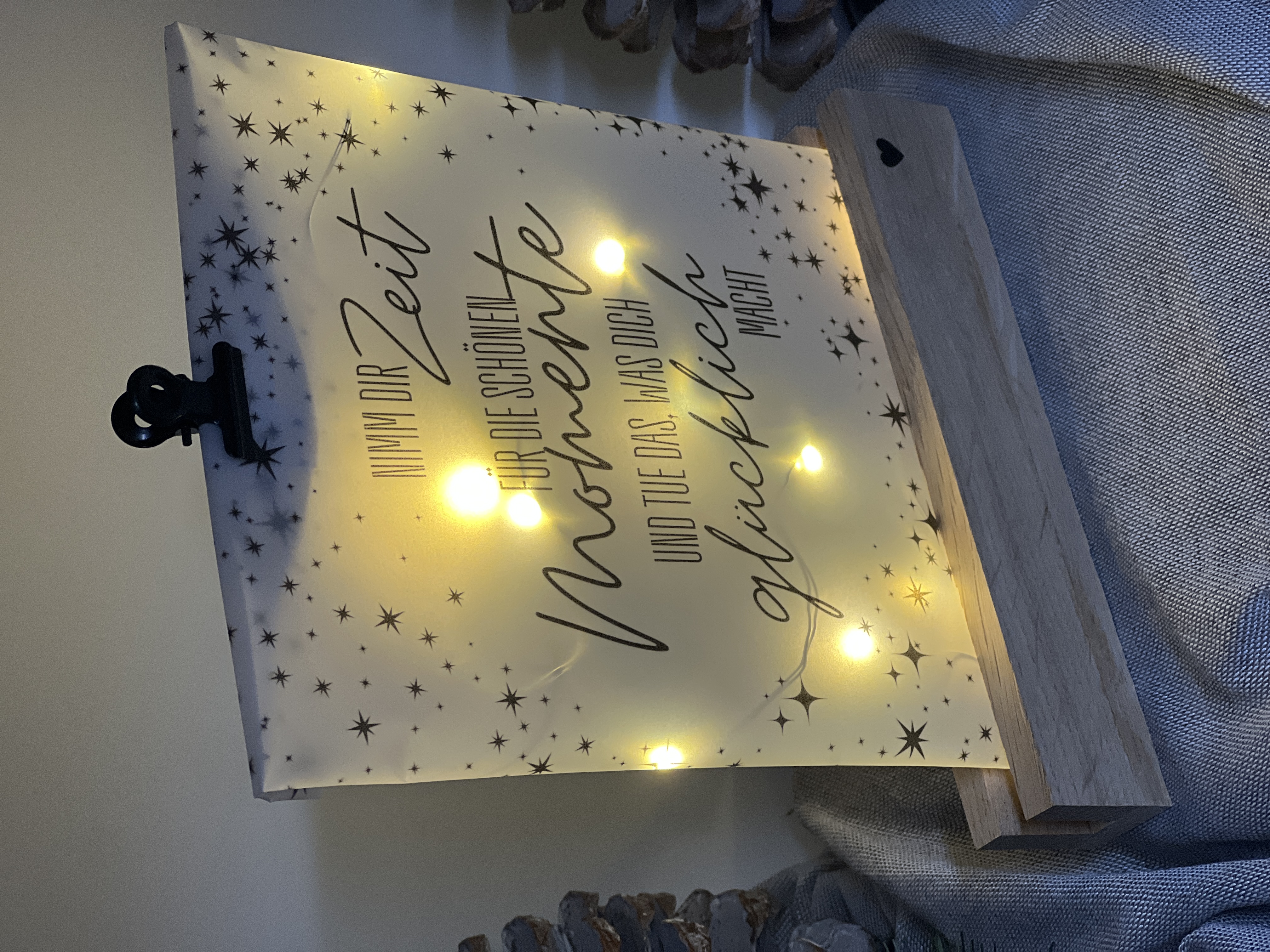 Verleihe deinem Zuhause eine besondere Note mit dieser charmanten Lichttüte. Diese dekorative Tüte ist mit einem funkelnden Sternen-Muster verziert und enthält einen inspirierenden Spruch, der dich dazu ermutigt, dir Zeit für die schönen Momente im Leben zu nehmen.