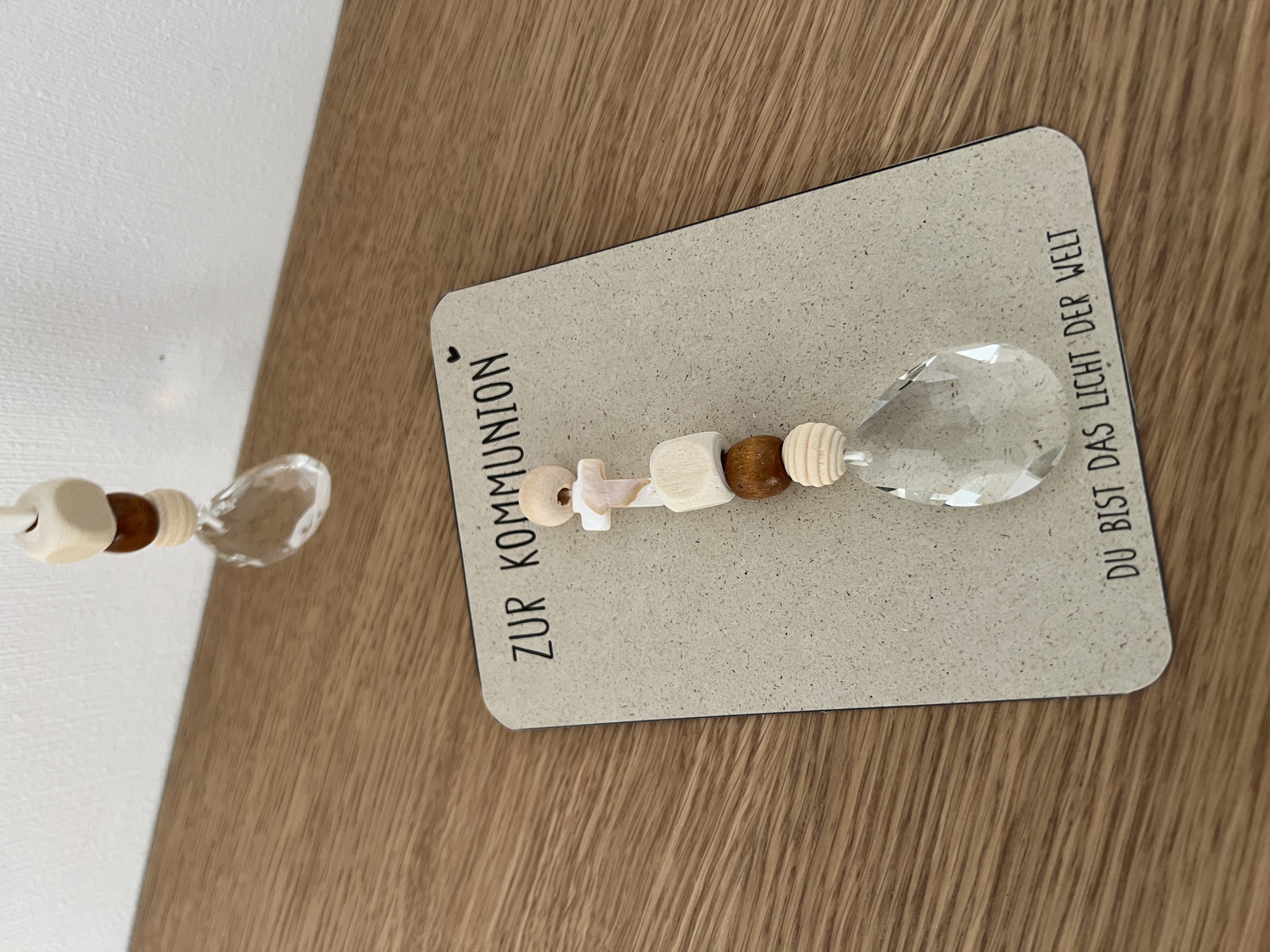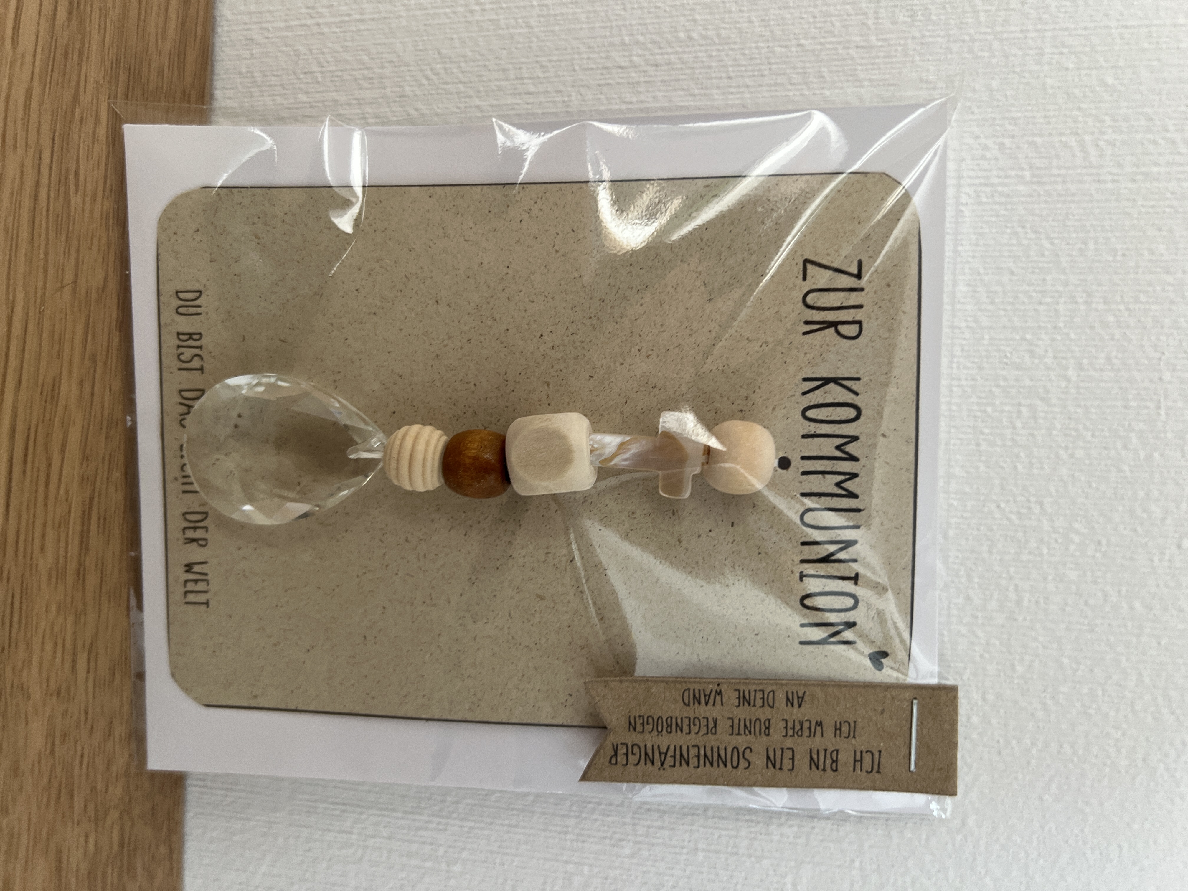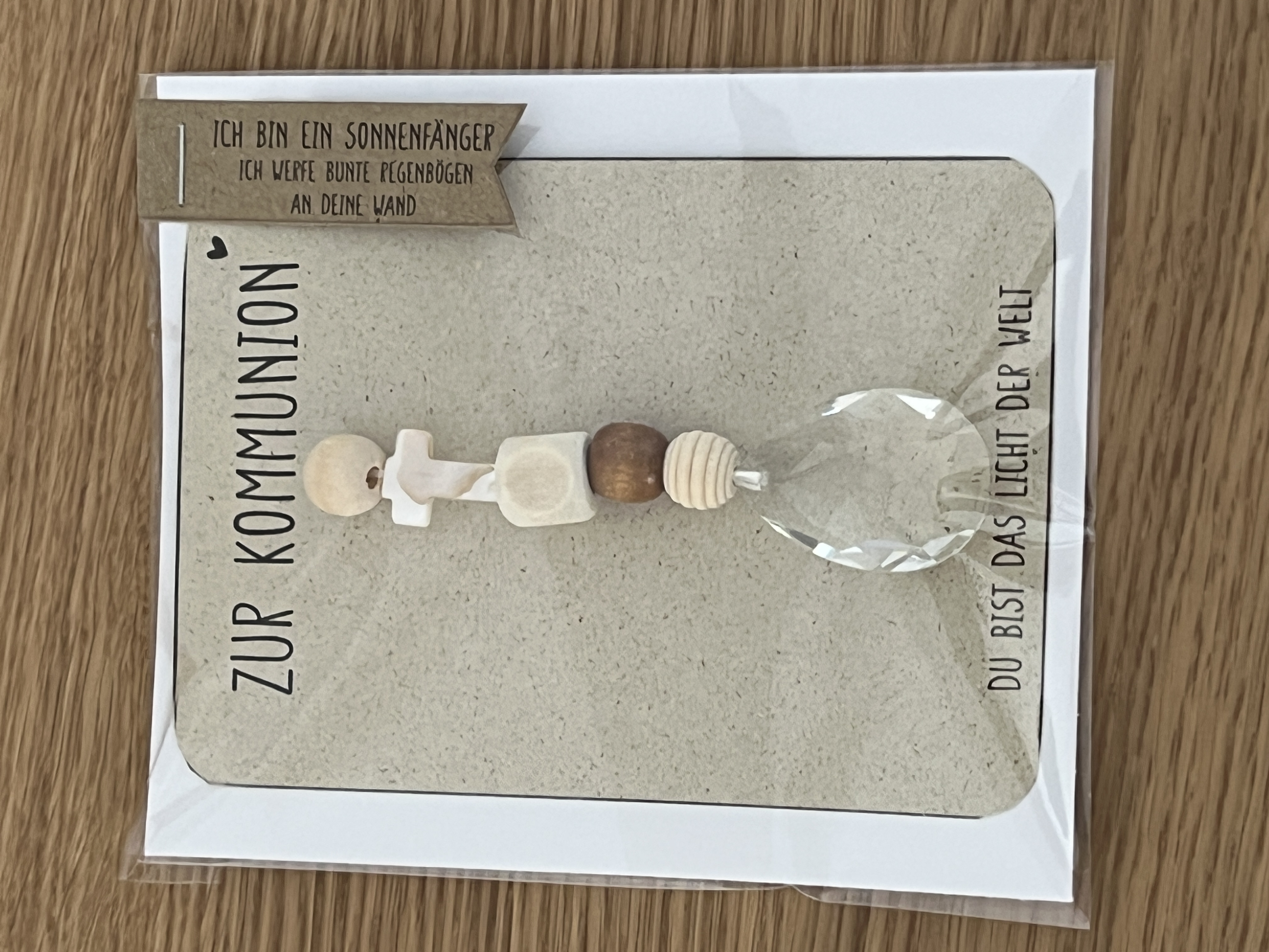 In Kombination mit den natürlichen Holzelementen und dem zarten Kreuz entsteht ein liebevoll gestalteter Sonnenfänger, der für Licht, Hoffnung und Geborgenheit steht. Die Karte mit der Aufschrift „Zur Kommunion – Du bist das Licht der Welt“ macht diesen Sonnenfänger zu einem ganz besonderen Geschenk.